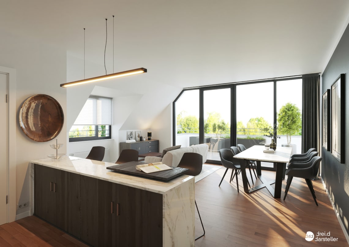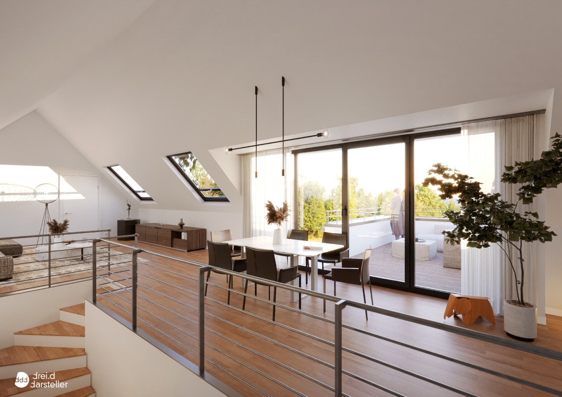 Dachgeschoss, Dachterrasse mit Rundumblick, Raumhöhe bis ca. 3,60 m